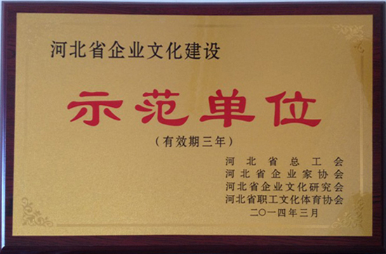 3月20日,河北省總工會、河北省企業家協會、河北省企業文化研究會、河北省職工文化體育協會聯合發布冀企協字【2014】15號文件,公布企業文化建設示范單位評選結果。其中,我公司被命名為河北省企業文化建設示范單位,董事長韓立君被命名為河北省企業文化建設先進個人。