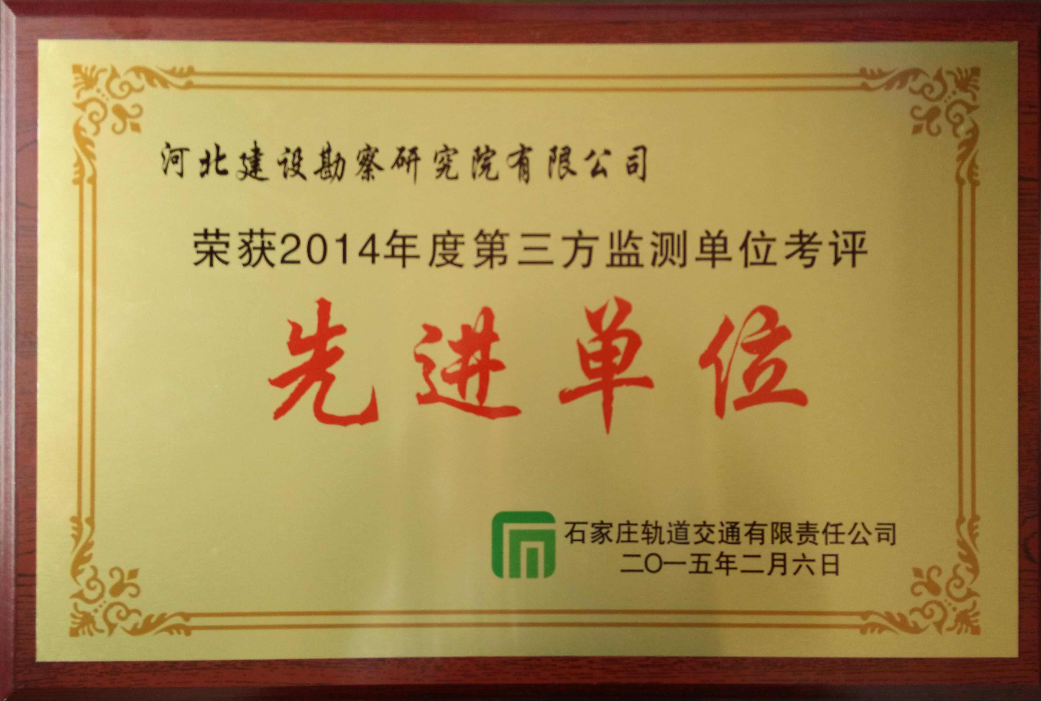 近日,我公司被石家莊軌道交通有限責(zé)任公司評為2014年度第三方監(jiān)測單位考評先進(jìn)單位。
