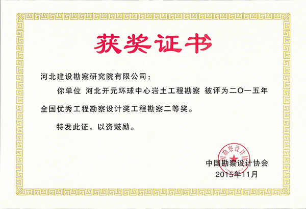 近日,公司兩項工程分別榮獲2015年度全國優秀工程勘察設計工程勘察一、二等獎.一等獎:邯鄲金世紀新城巖土工程勘察、基坑支護、地下水控制及監測;二等獎:河北開元環球中心巖土工程勘察。