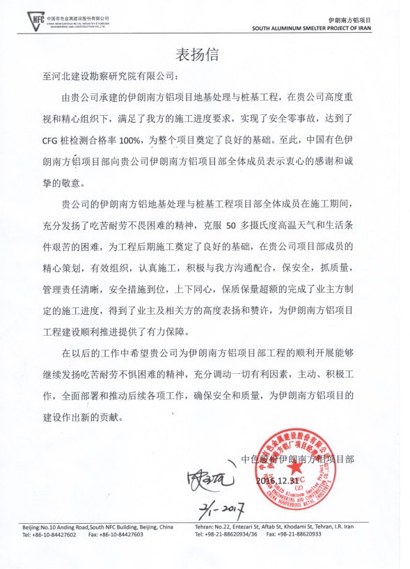 2016年12月31日,公司收到中色股份伊朗南方鋁項(xiàng)目發(fā)來的表揚(yáng)信。由我公司承建的伊朗南方鋁項(xiàng)目地基處理與樁基工程,在我公司的高度重視和精心組織下,滿足了甲方的施工進(jìn)度要求,實(shí)現(xiàn)了安全零事故,達(dá)到了CFG樁檢測合格率100%,保質(zhì)保量超額完成了業(yè)主方制定的施工進(jìn)度,得到了業(yè)主及相關(guān)方的高度表揚(yáng)和贊許。