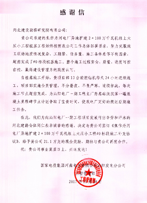 我公司承建的焦作丹河電廠異地?cái)U(kuò)建2×100萬千瓦機(jī)組上大壓小工程樁基工程,始終按照業(yè)主工作總體部署要求,努力克服施工現(xiàn)場地質(zhì)情況復(fù)雜、工期緊、任務(wù)重、施工條件差等不利因素,超前完成了#0標(biāo)段樁基施工,整個(gè)施工過程安全、質(zhì)量、進(jìn)度可控在控,贏得了建設(shè)管理方的高度認(rèn)可。11月28日,國家電投集團(tuán)河南電力有限公司沁陽發(fā)電分公司工程管理部發(fā)來感謝信,對我公司項(xiàng)目部員工表示感謝,并期待與我公司的再度合作。
