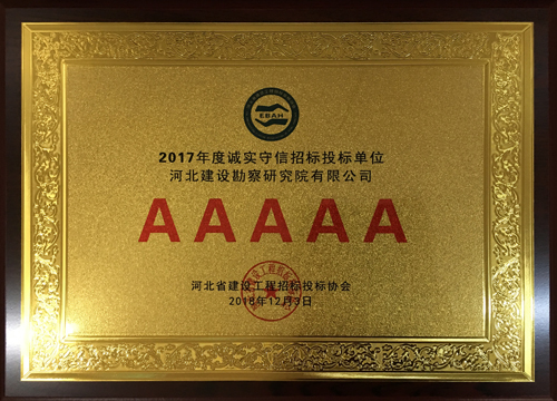 近日,我公司被河北省建設工程招標投標協會評為2017年度河北省建設工程招標投標誠實守信5A級施工企業。