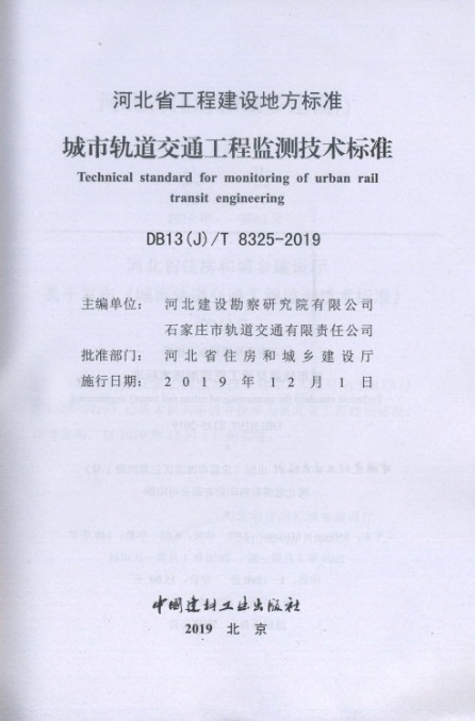 近日我公司主編的河北省工程建設地方標準《城市軌道交通工程監測技術標準》(DB13(J)/T8325-2019)由河北省住房和城鄉建設廳發布,于2019年12月1日起實施,正式出版發行。這是由我公司主編發行的第11項地方標準。