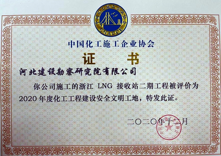 近日,由我公司施工的浙江LNG接收站二期工程被中國化工施工企業(yè)協(xié)會(huì)評(píng)為“2020年度化工工程建設(shè)安全文明工地”,并獲獎(jiǎng)牌和榮譽(yù)證書。