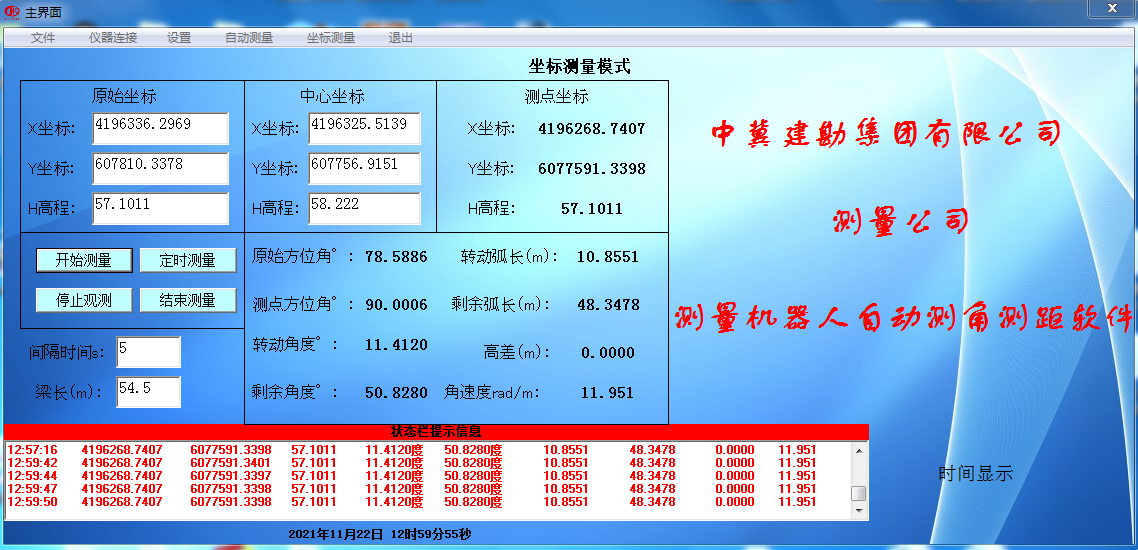 在橋梁轉(zhuǎn)體過程中,我們采用國(guó)內(nèi)最先進(jìn)的全自動(dòng)測(cè)量機(jī)器人并結(jié)合自主研發(fā)的跟蹤測(cè)量軟件,對(duì)橋梁實(shí)施運(yùn)行軌跡和震動(dòng)監(jiān)控監(jiān)測(cè)。在轉(zhuǎn)體過程中嚴(yán)格控制轉(zhuǎn)體橋轉(zhuǎn)體角速度,并對(duì)軸線合攏進(jìn)行測(cè)量,指揮施工單位對(duì)轉(zhuǎn)體橋進(jìn)行點(diǎn)動(dòng),最終達(dá)到設(shè)計(jì)要求,本次軸線合攏精度達(dá)到5mm,滿足設(shè)計(jì)要求。