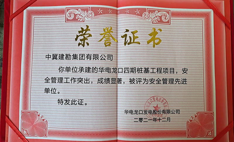 華電龍口四期樁基工程項目安全工作管理突出,被頒發“安全管理先進單位”榮譽證書,張金根被評為“安全管理先進個人”榮譽稱號。