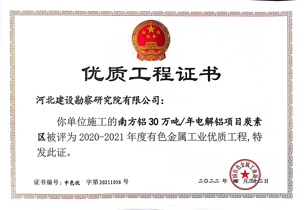 由我單位施工的南方鋁30萬噸/年電解鋁項目碳素區被評為2020—2021年度有色金屬工業優質工程獎。