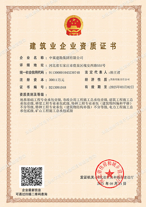 集團公司于2023年8月24日喜獲電力工程施工總承包貳級資質,該資質的取得將大力促進我公司在電力能源市場的業務拓展能力,由電力項目的地基基礎專業承包向土建、安裝總成承包邁進,為獨立承接風電、光電等電力新能源項目提供了準入證。