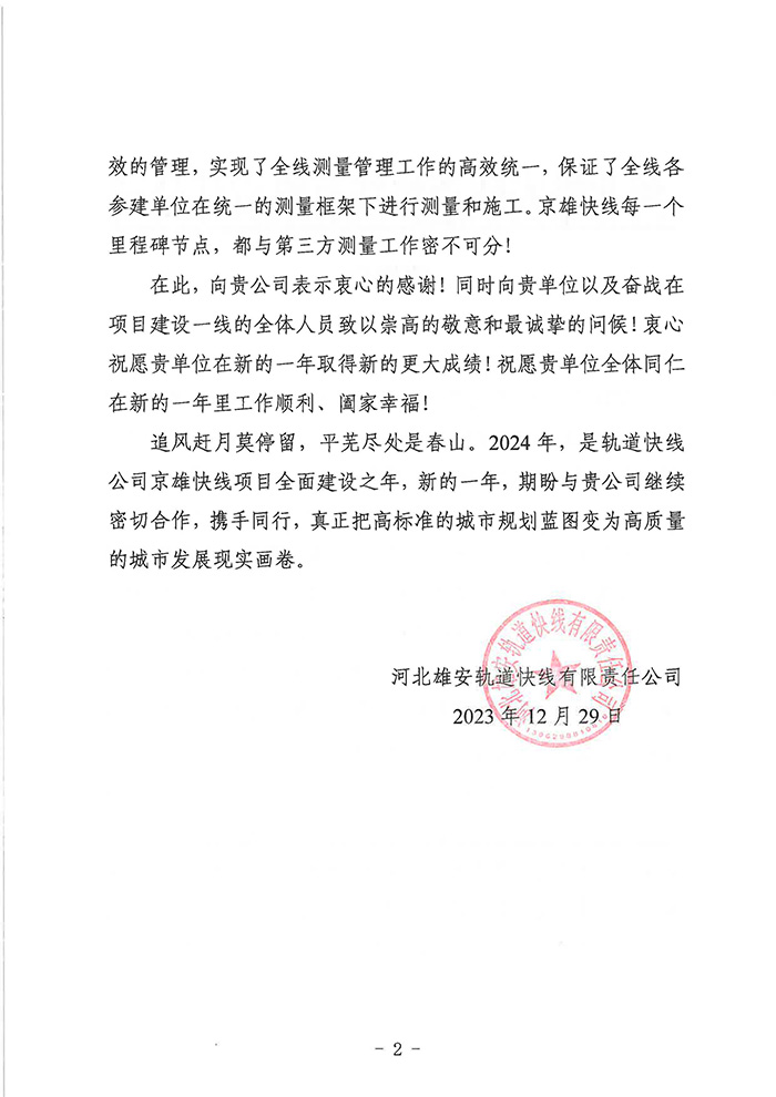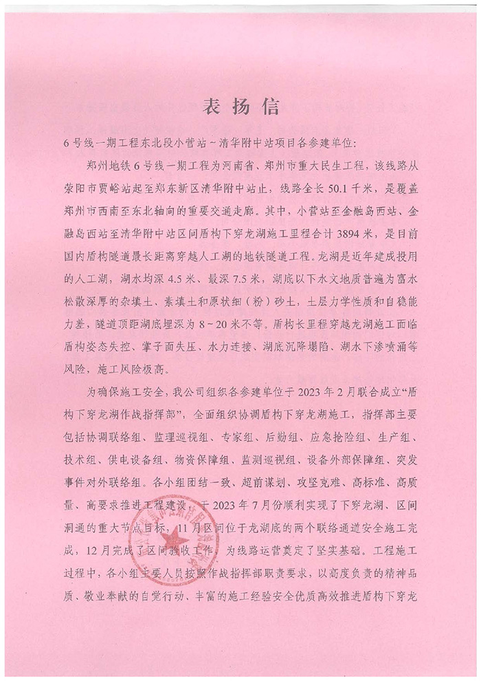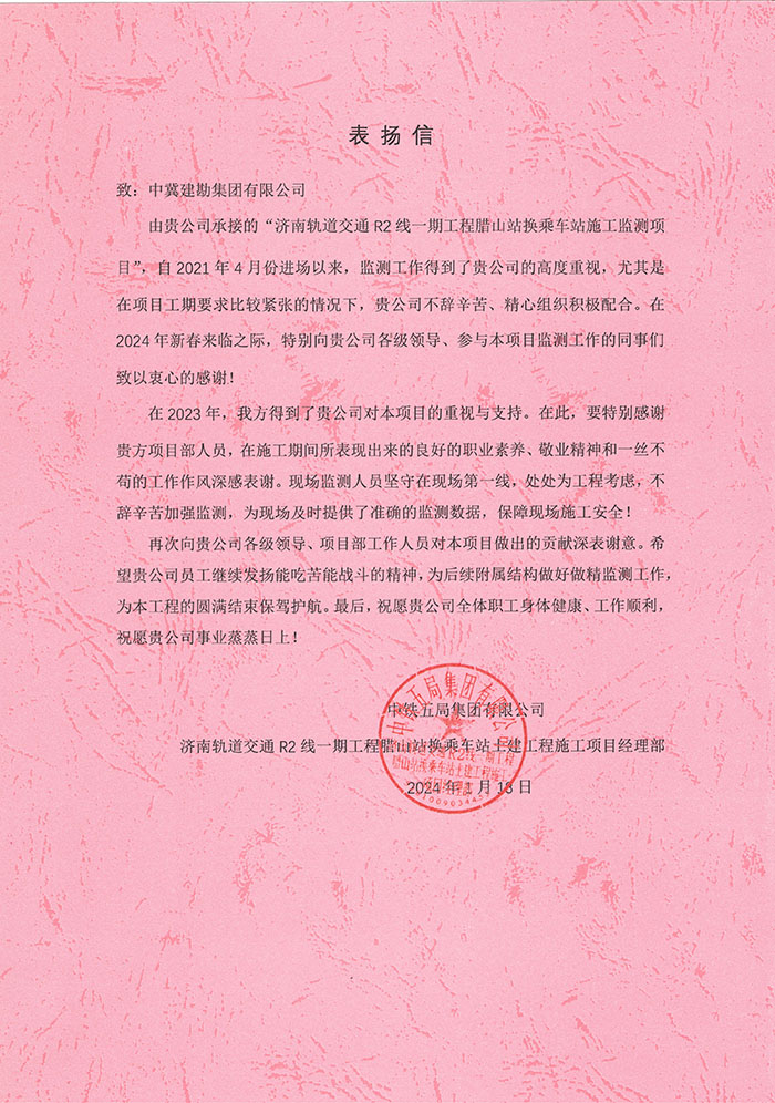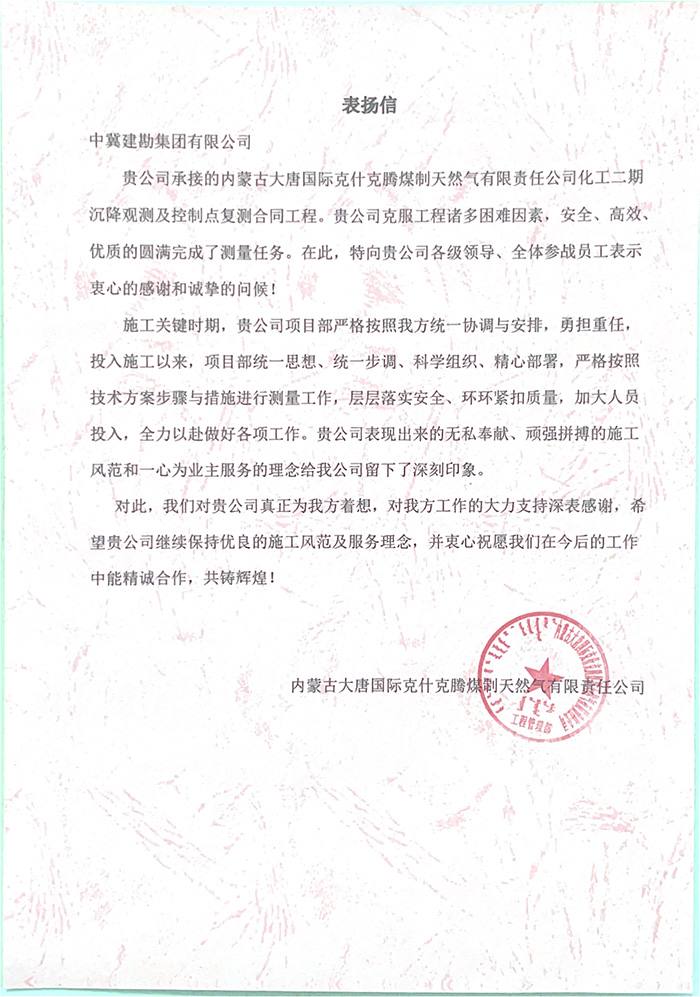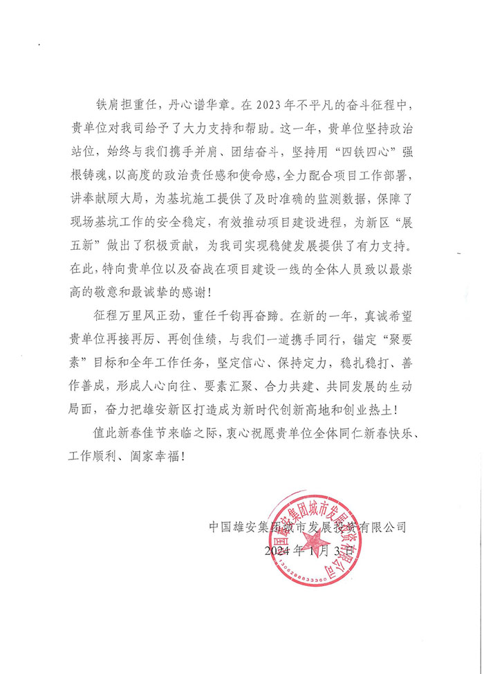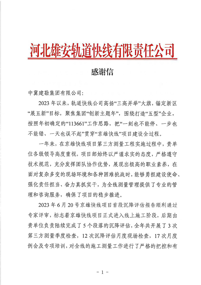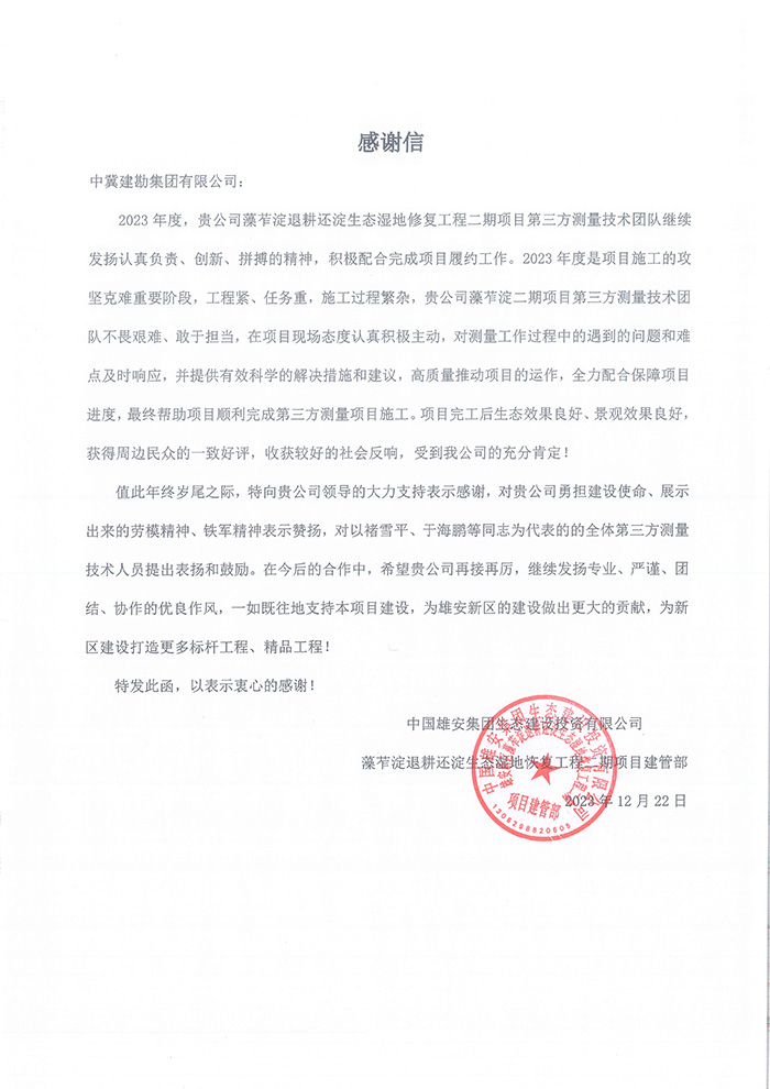 近期,集團公司陸續收到中國雄安集團城市發展投資有限公司、河北雄安軌道快線有限責任公司、中國雄安集團生態建設投資有限公司、中鐵五局、中鐵十七局、鄭州地鐵集團、內蒙古大唐國際克什克騰旗煤制天然氣電廠、大唐內蒙古多倫電廠等業主單位發來的感謝信。我公司認真負責、敢打能打硬仗的工作態度、頑強拼搏的施工風范和一心為業主服務的理念,贏得了業主的高度認可和贊揚,特發來感謝信深表感謝!