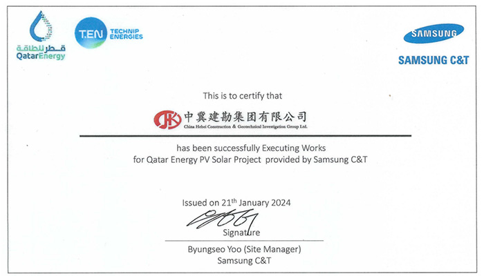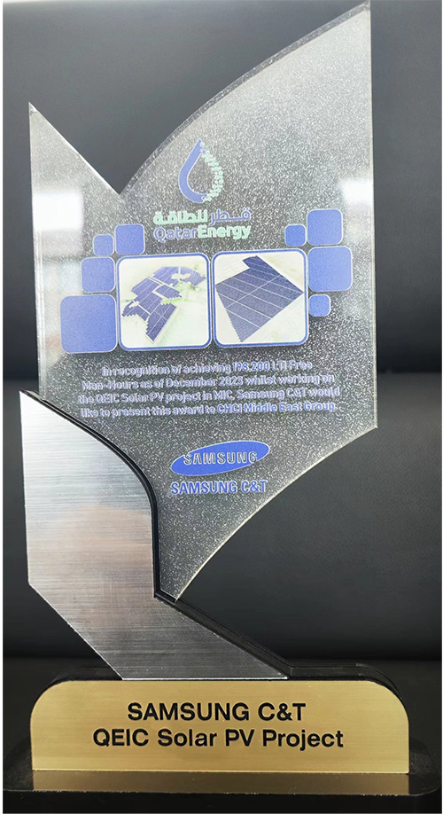 我公司收到卡塔爾能源875.5MW光伏發電項目業主方卡塔爾能源和總包方三星C&T公司聯合頒發的獎杯和推薦信。業主及總包方高度認可我公司項目履約能力,贊揚我司對該項目成功交付做出重大貢獻,表示愿意與我司建立長期合作關系。基于我司卓越的履約表現,三星C&T公司授予我司推薦信。