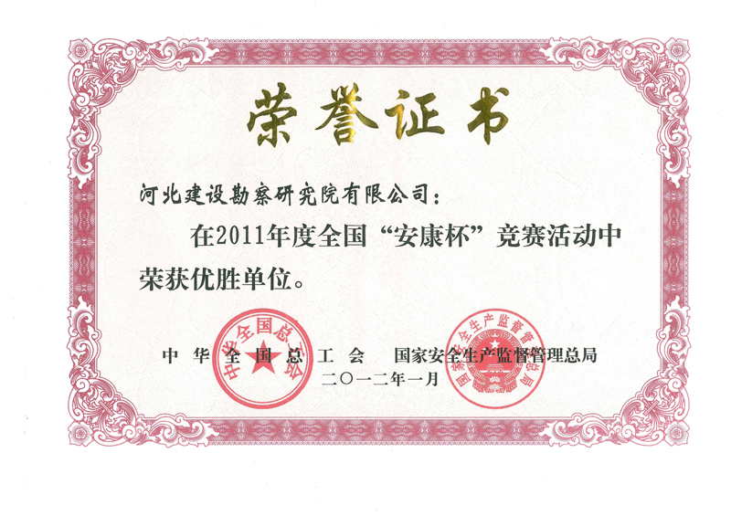 公司在2011年度“安康杯”競賽活動(dòng)中,被中華全國總工會(huì)、國家安全生產(chǎn)監(jiān)督管理總局評為優(yōu)勝單位,這是我公司連續(xù)第八年獲此殊榮。