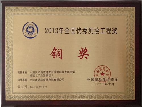 近日,由我公司完成的大連長興島臨港工業(yè)區(qū)管網普查項目第一標段(產業(yè)區(qū)標段)被中國測繪學會評為優(yōu)秀測繪工程銅獎。